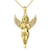 This angel diamond pendant necklace is a beautiful expression of faith and elegance. Crafted in high-polish 10K or 14K gold, it features a praying angel with intricate wings set with brilliant stones that sparkle like diamonds. The warm glow of the gold enhances the graceful silhouette, creating a piece that feels both timeless and meaningful.