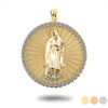 The Diamond Cut Lady of Guadalupe Cubic Zirconia Halo Medallion Pendant Necklace is a stunning expression of faith and elegance. Featuring a beautifully detailed medallion of the revered Lady of Guadalupe, this pendant showcases exquisite craftsmanship, highlighted by a diamond-cut finish that enhances the intricate design. Surrounded by a sparkling halo of cubic zirconia stones, the pendant catches the light beautifully, adding a touch of brilliance that elevates its overall aesthetic. This piece not only serves as a striking accessory but also carries deep spiritual significance, making it a cherished symbol of devotion and protection.