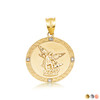 This Saint Michael pendant is a round medallion that beautifully depicts Archangel Michael in detailed relief, standing triumphantly as a symbol of strength, courage, and divine protection. Set in your choice of 10K or 14K gold, this piece features a textured background and ornate border, highlighted with sparkling diamond accents placed at four points around the medallion. The high polish finish adds shine and elegance, enhancing its intricate craftsmanship.